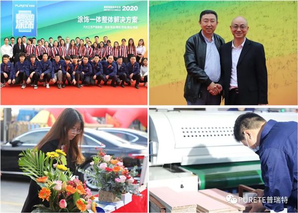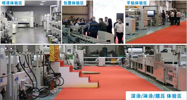 同期在普瑞特工厂展出滚涂、淋涂、喷涂、包覆、膜压、平贴、180米的U型无人生产线,阵容庞大,震撼全场。