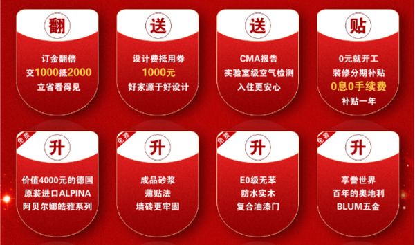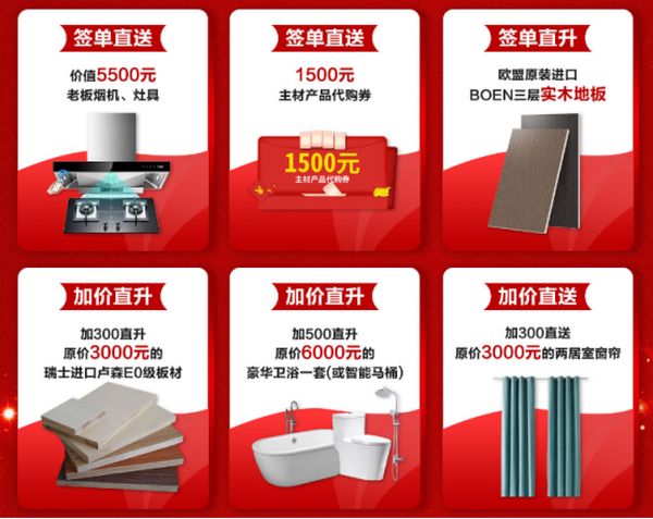 六重特惠:签约直送价值5500元的老板烟机、灶具,1500元的主材产品代购券,升级欧盟原装进口实木地板,加300直升3000元的瑞士卢森E0级板材,加500直升原价6000元的品牌卫浴一套,加300直升3000元的两居室窗帘。