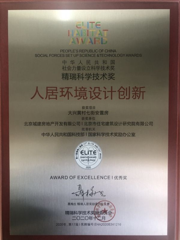12月13日,“聚焦大循环,助力新消费”——全联房地产商会2020年会暨第17届精瑞人居奖颁奖典礼”活动在北京举办。此次论坛吸引了来自人居建设发展以及数字生态服务领域的相关领导、专家学者、企业负责人等500位嘉宾参与。北京城建房地产开发有限公司携手北京市住宅建筑设计研究院有限公司开发设计的大兴区黄村七街安置房福兴雅苑项目被授予人居奖设计类优秀奖。
