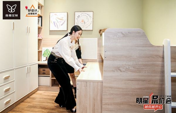 直播刚开场,来到了维意新北欧【柏林童话】功能房,主持人向张俪展示了双滑轨设计,床、桌可以根据需求展开、藏起,大容量分区的储物柜,更让宝宝衣物整齐摆放,整个房间无异味,高品质的表现解答张俪对儿童房的所有要求。主持人顺势宣布只要购买双十二特权卡,儿童房免费升级0醛蝶态板的重磅福利,张俪惊呼直呼“想入同款”。
