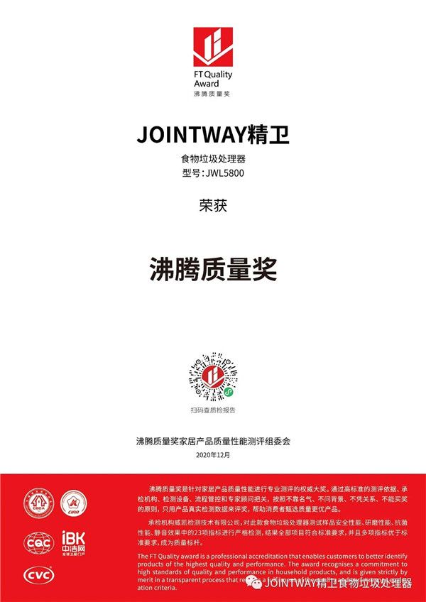 在经过半年多时间的专业、严谨、客观、公正的测评之后,12月15日,2020“沸腾杯”食物垃圾处理器性能测评的颁奖典礼在线上云端隆重举行。精卫厨房垃圾处理器JWL5800荣获“沸腾杯”质量奖!本次荣获质量奖,证明精卫厨房垃圾处理器高品质产品得到市场和业界的高度认可。