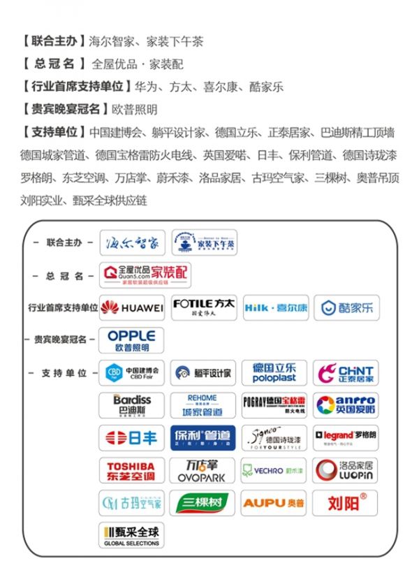 大会智库支持家装下午茶智库、远咨询;大会资本顾问红星资本、联创资本、棋盘资本、BUclub;协会商会平台支持全球设计师知识更新服务平台、全国房地产商会联盟建筑装饰专业委员会、中国林业产业联合会整装分会、深圳市家装家居行业协会、天津市家居商会、合肥市建筑装饰协会、青岛市室内装饰行业协会、乌鲁木齐市家庭装饰装修协会、郑州市家居装饰设计商会、威海建筑装饰协会、威海江西商会、中国家装界精英汇、中国装饰工程联盟、红树林商学社、中国家装私董会、知者研究、DA软装学院、壹启研习社等。