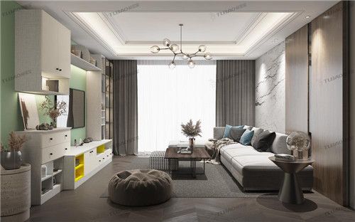 客厅由浅色和清新色搭配组合。空间的主色调以浅色的白灰色或冷色系色彩为主,点缀上鲜艳跳脱的柠檬黄、抹茶绿等,让空间变得活泼感十足。