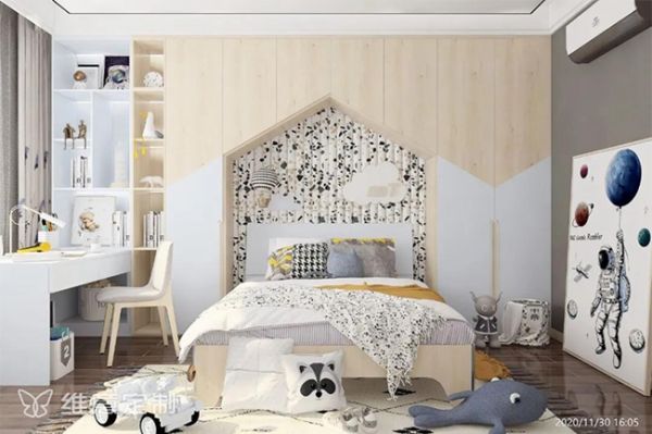 ▲以木色为主基调,森林木屋元素贯穿房间,让空间节奏跳跃,使得空间各面都更加丰富。