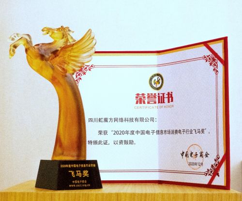 2020年12月18日,中国电子商会理事会及常务理事会在广州召开,长虹、华为、联想、bilibili、京东方等众多知名企业应邀出席。在本此大会上,长虹旗下四川虹魔方网络科技有限公司凭借在家庭智慧大屏、智能电视运营领域的突出表现,斩获“飞马奖”,成为智能大屏OTT领域唯一一家获得此项殊荣的企业。