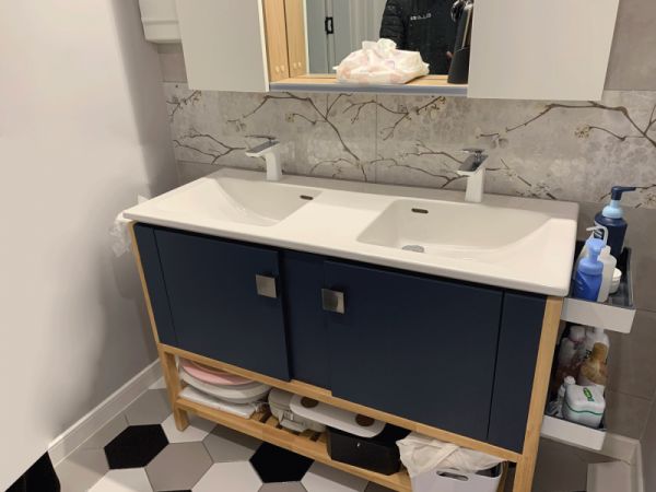这位业主购买了宜来双盆设计的田园诗浴室柜,使用一年后依旧对这套浴室柜柜赞不绝口,一家三口在要求品质感的同时也希望有更多的储物空间,这套满足了他们的需求。