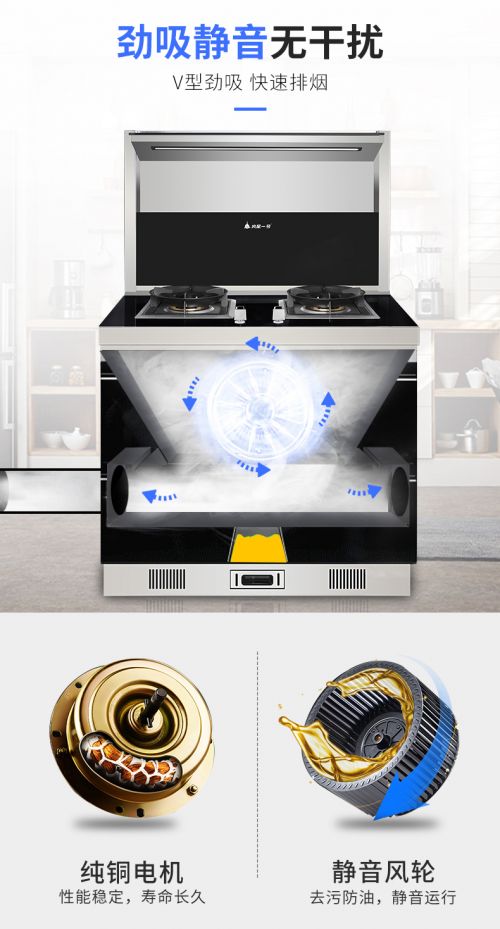 油烟吸净率高达99.96%的同时,因为集成灶独特的吸油烟方式,取消了置于人体头部的噪音源,同时还应用了静音风轮设计技术,大大减小机器工作噪音。