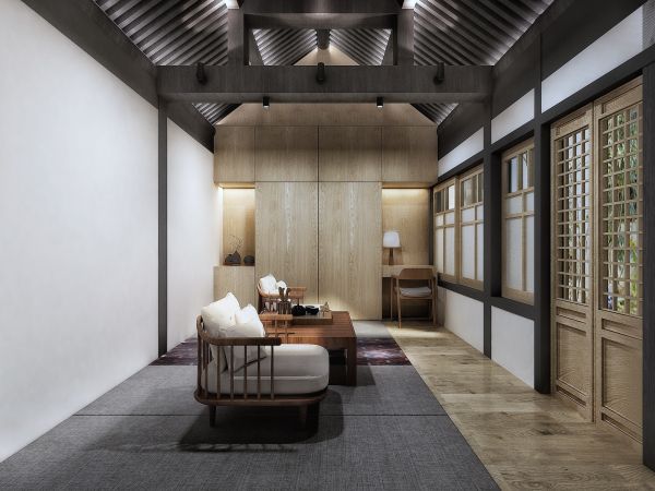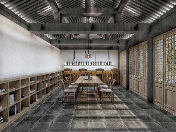 这个项目中不仅有庭院景观,还有功能丰富的共享空间。他在"东南西北"四个房内详细规划了功能区,有书画、酒吧、温泉、会议区、住宿区等。在不同时间段使用时,人们通过空间转换来完成使用,"TANG.伴儿"也有自己的智能空间预约系统,可以方便大家使用。