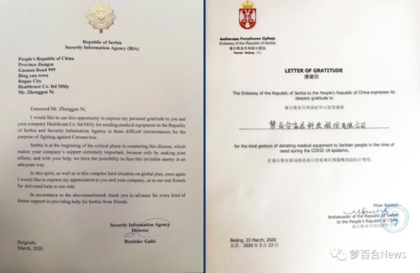 期间,梦百合家居收到了来自塞尔维亚政府和塞尔维亚驻中国大使馆的官方致谢。