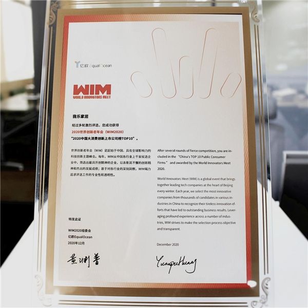 近日,由亿欧EqualOcean主办的World Innovators Meet (WIM) 2020世界创新者年会顺利举办,定制家居领域头部企业我乐家居受邀参加此次盛会。大会同期发布了2020世界创新奖系列榜单和报告,囊括了来自全球范围内的优秀创新上市公司、创业公司、投资机构等。其中,凭借多年来在产品、设计、工艺、营销等层面的创新引领和持续深耕,我乐家居成功上榜“2020中国大消费创新上市公司榜TOP10”。