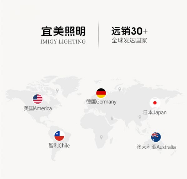 2004年品牌成立以来,宜美照明凭借其对照明产品的执着精神和以高品质中等价位的市场定位,十几年来始终将高品质的照明产品远销西欧、美国、澳大利亚,在国外市场赢得了很高的知名度和美誉度,也交出了2017-2019年国内平板灯产品出口前三、筒射灯产品出口前四、灯具产品出口企业排名靠前的好答卷。