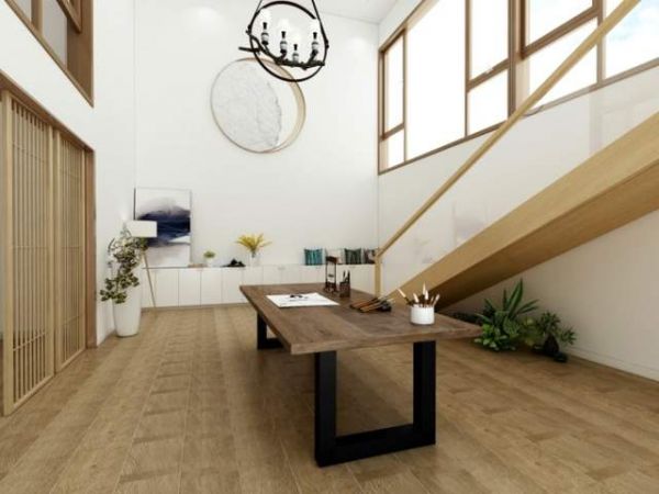 负一层用淡黄色的色彩基调晕染着这里独具一格的安静,原木书桌置身其中,让安静中增添了一份书香气息。