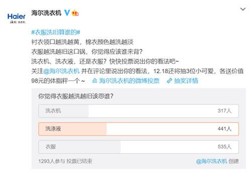 截止12月21日11时,共有1293人参与了海尔洗衣机发起的投票活动,衣物越洗越旧的原因也逐渐明朗。