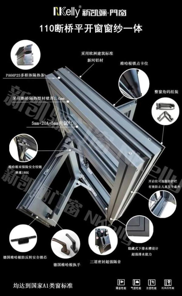 佛山新凯骊门窗在本年度6月份上市的新品--110断桥平开窗纱一体窗,依旧遵循企业以往严苛的生产标准,配合工匠精神和创新技术升级改造而诞生的110断桥平开窗纱一体窗相比之前的90平开窗系列81推拉门等产品更别致、质量更优,性能更佳。升级五金配件,全面性平框设计,在细节上精益求精,外观更精美。110断桥平开窗纱一体窗的出现刷新门窗颜值的新高度,直接赋予产品更多观赏性和价值感。