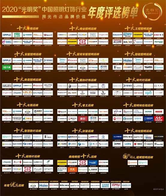 欧普照明、雷士照明、木林森照明、佛山照明、公牛、正泰居家、三雄极光、世林照明、阳光照明、新特丽照明,则以突出表现实力上榜2020"光明奖""十大年度品牌".