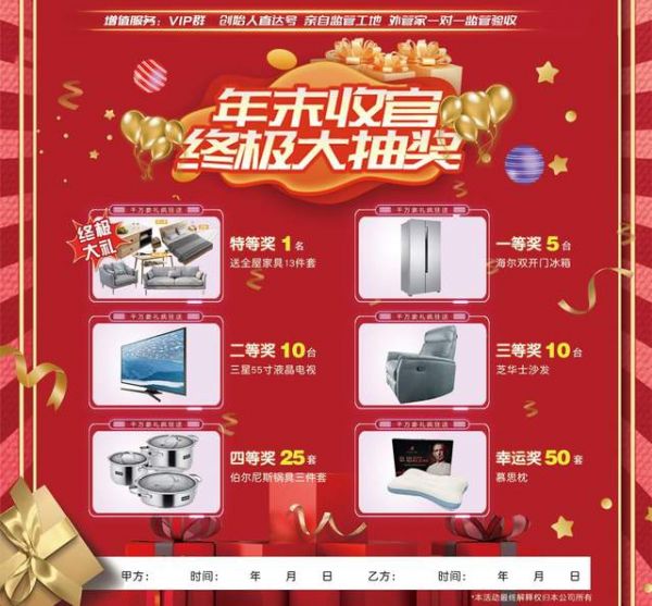 活动期间签单客户,即可抽取福袋大奖。其中包含华帝蒸箱、三星液晶电视、海尔双开门冰箱等。