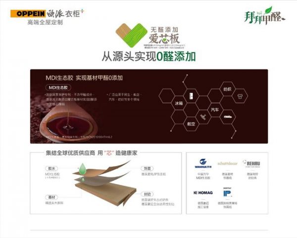 同时,欧派无醛添加爱芯板采用目前最环保的板材粘合剂——MDI生态胶。由于MDI生态胶不含甲醛,也不分解甲醛,是目前最环保的板材粘合剂,广泛应用于航空、汽车、纺织、家电等领域。