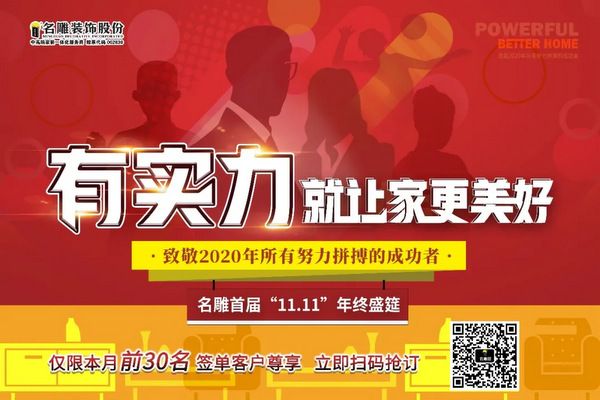 2020年最后一个月,名雕首届“11.11”年终盛筵,致敬回馈所有努力拼搏的成功者,我们有实力,就让家更美好!