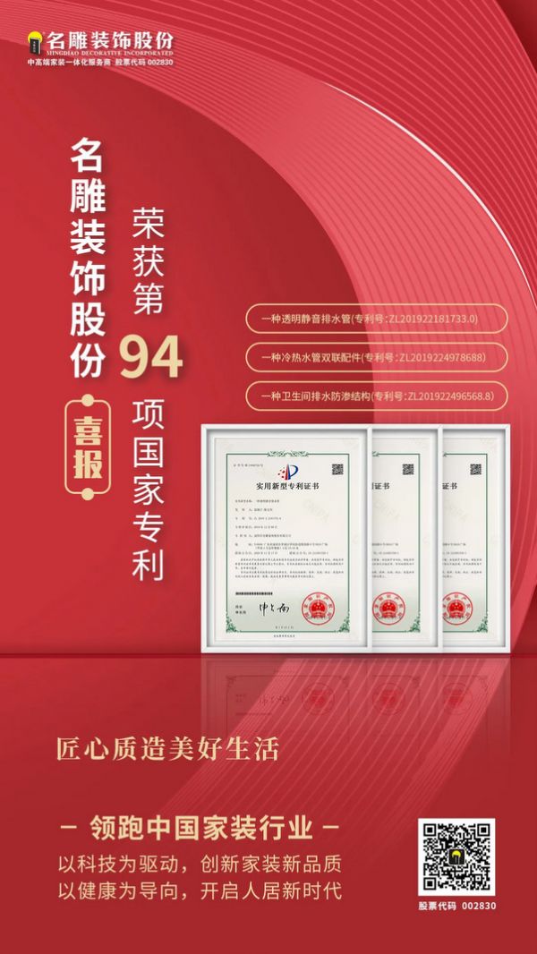 工地大比武不仅是一次比赛,更是名雕为了不断提升家居服务水平的匠心行动。此外,今年名雕以健康家居为导向,加大投入研发工艺材料,目前已获94项国家专利(含授权通过的专利已达99项),其中2020年申报国家专利高达30项,全力为客户打造健康家居,守护家人健康。