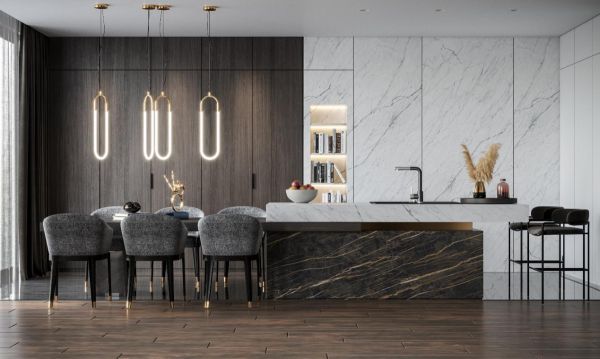 同时,岩板的台面还能加上无线充电的功能,赋予了台面极致整洁的美感;