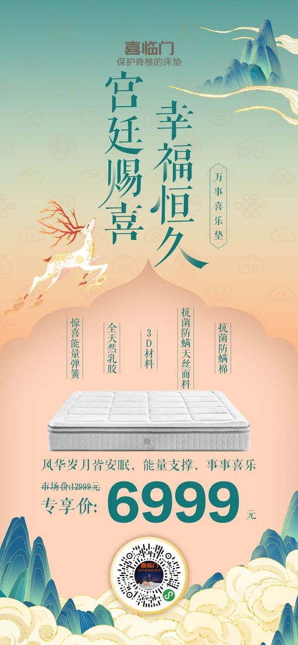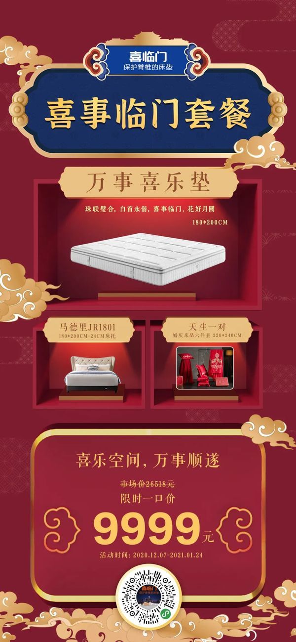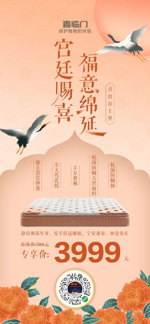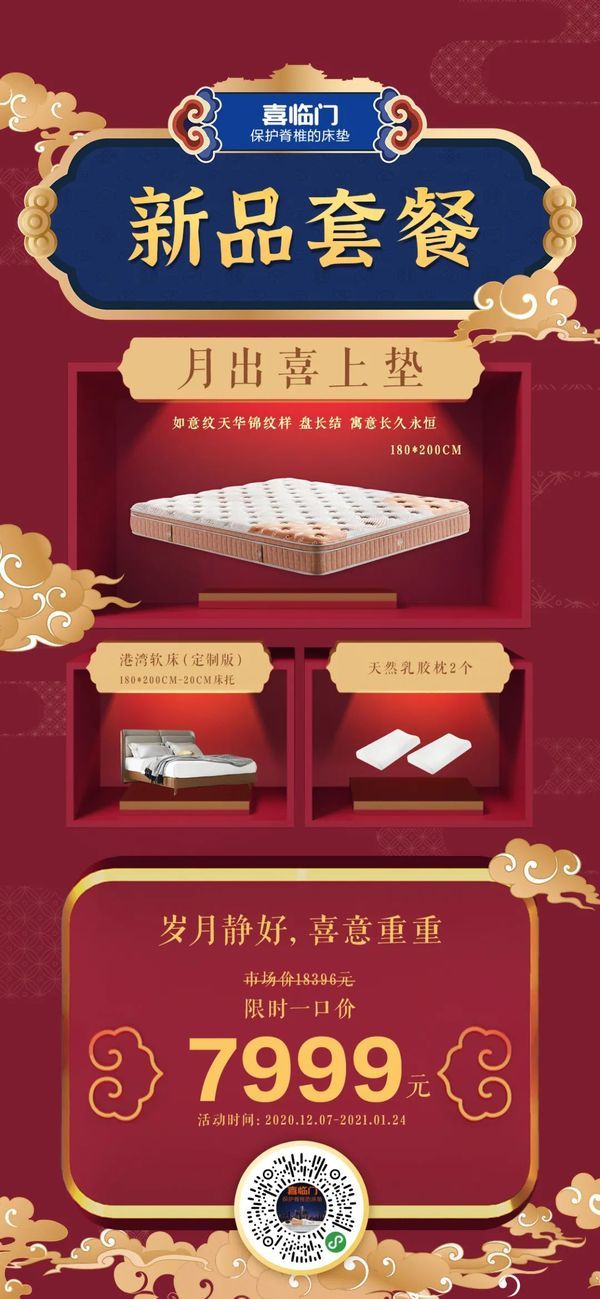 喜临门在2020年12月-2021年1月“宫囍恭喜”年终大促活动中,全新开发上市“宫囍恭喜”系列床垫,从古老传统经典纹饰中汲取灵感,将多种寓意幸福和祥瑞的纹样,赋予床垫全新的设计美感和文化内涵。