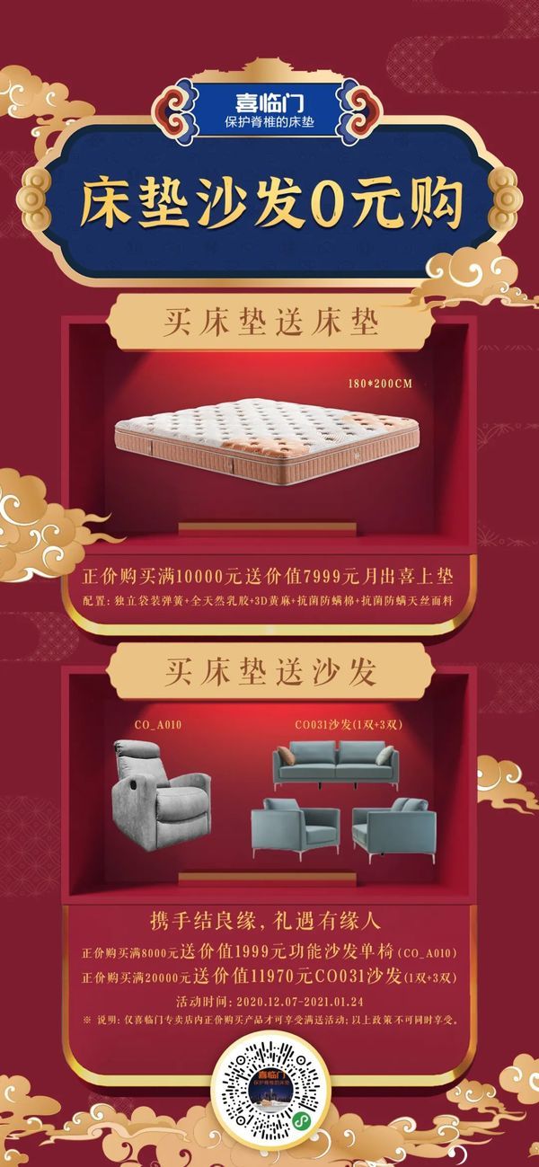 本次大促活动,两款新品床垫均拿出钜惠价格,在一年的末尾回馈喜临门所有消费者。与此同时,还有床垫沙发0元购,买床垫送床垫,买床垫送沙发等多重促销优惠。
