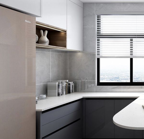 U字型橱柜,根据洗切煮流程设置功能区,吊柜及抽屉的设置增加储物功能,整体风格时尚简约。