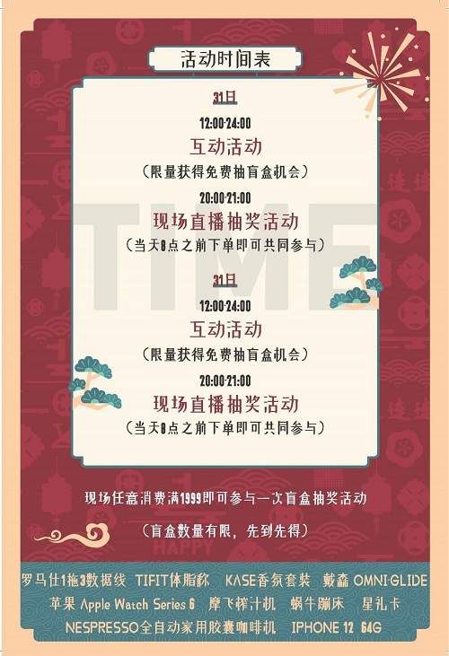 3. 活动期内,消费满1999元,可获取【现场开盲盒】的机会一次。(数量有限)