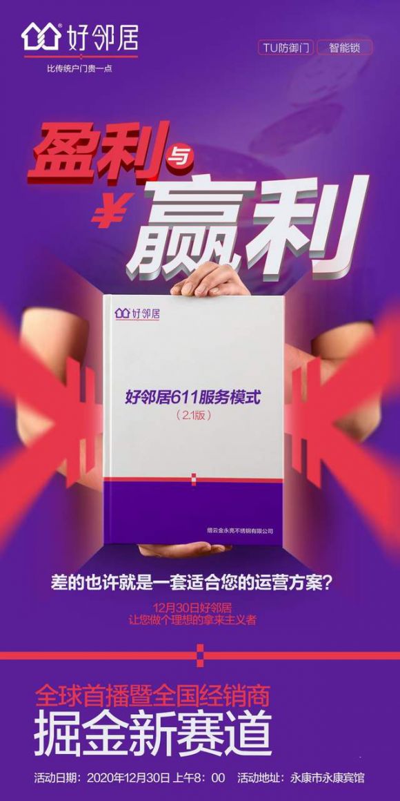 很多人在门业市场都是摸着石头过河,迷茫不已。而好邻居有成熟的培训系统、管理系统、服务系统,给你备好弹药与粮草,就等你来施展才华!好邻居,一个有故事与有魅力的企业。就在2021蓄势待发,带来无限商机!12月30日,将在中国门都永康举行全国经销商大会,你想了解什么是TU防御门吗?你想了解为什么现在好邻居这么火?全新的“611服务模式”具体内容是什么吗?好邻居的这场全国经销商大会,千万不要错过,届时将发布新品、营销培训、给力政策回馈经销商等,全新的好邻居将精彩亮相!(郑旭峰)