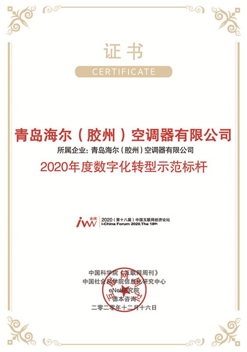作为智慧家庭的代表企业,青岛海尔(胶州)空调器有限公司(以下简称“海尔空调胶州互联工厂”)获2020年度数字化转型示范标杆、优秀智能制造企业。主办方认为,海尔空调胶州互联工厂承载了海尔智家最新的工业设计、生产制造以及销售理念,通过数字化变革,提高了用户体验,实现了真正的用户个性化订单生产。