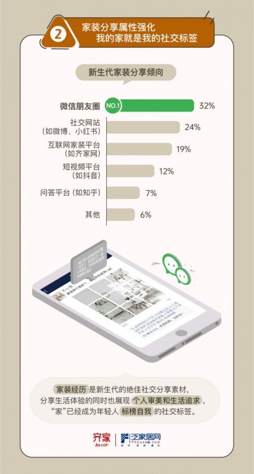 报告显示,大部分年轻人热衷于在社交平台分享由自己亲自跟踪、监督、决策的家装成果,分享平台包括但不限于微信朋友圈、微博、小红书、互联网家装平台、短视频平台等。家装的社交属性逐渐凸显,而年轻人也能在与社交好友的交流中获得自我满足感。