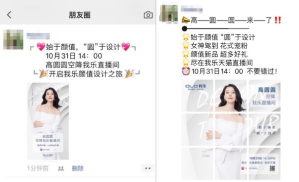 以十一月轰动全国的高圆圆直播为例,早在近一月前我乐家居总部就开始了线下和线上的同步宣传,在线上通过门店导购在朋友圈发布宣传视频和海报,线下布置好活动相关物料和店面设计给到全国各地的我乐家居经销商,保证每一位到店的消费者了解活动详情。