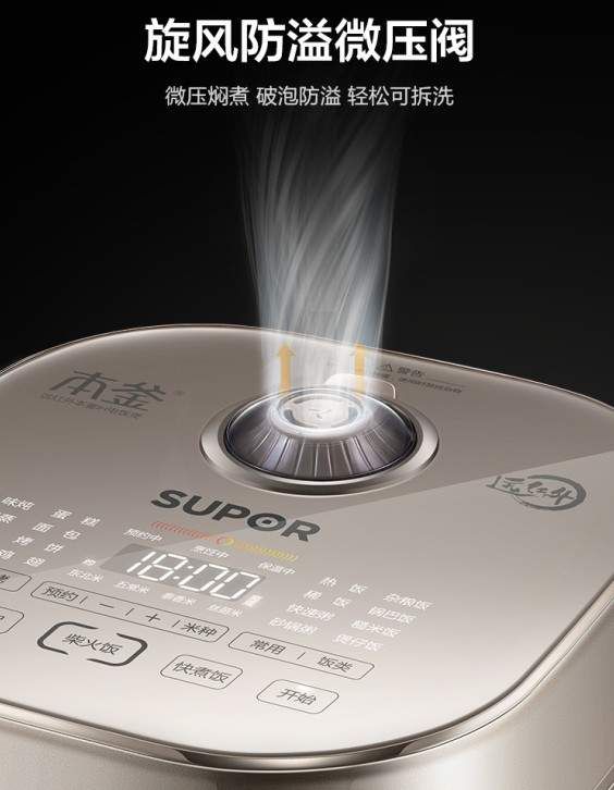 苏泊尔远红外电饭煲的穿透加热技术,让高温直达米芯,远红外穿透技术直接让热量越过水而作用于米粒本身,让大米的口感更软糯饱满。面板上的旋风防溢微压阀能在沸腾的锅内横扫浮泡,达到水满而不溢锅的效果,延长大火沸煮的时间,以让米粒更软更易消化。
