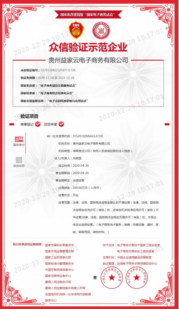 益家云电商平台此次能够获批“众信验证”并被纳入“国家互联网诚信交易及标准化示范平台”,证明益家云电商平台的诚信度经过九大国家数据库的权威审核符合相关国家标准,这是对其益家云电商平台诚信度,平台可信度,产品品质、行业地位的认可和认证。