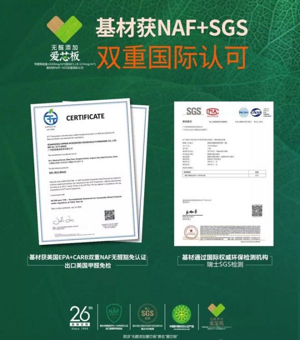 欧派无醛添加爱芯板凭借出色的环保性能,通过了CARB NAF+EPA NAF双重权威认证,更获得NAF+SGS双重国际认可。美国环保署的NAF(No-added formadehyde)无醛豁免认证,意味着出口美国市场时,无需进行甲醛检测。由于认证过程苛刻,被视为目前全球最难通过的认证。SGS是全球领先的检验、鉴定、测试和认证机构,是全球公认的质量和诚信基准,总部在瑞士,获得SGS认证意味着欧派无醛添加爱芯板达到了欧洲的至高环保要求。