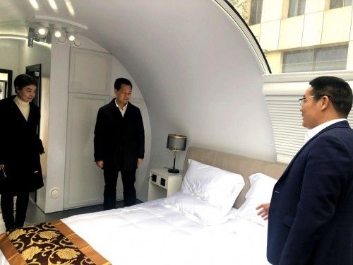 上午10点,正式开始太空舱的试舱环节,人们汇集在太空舱前,工作人员为各领导和观众讲解太空舱品牌理念、生产过程以及使用功能,人们都积极到室内进行体验。期间人们提出最多的问题就是:游客过夜产生的废水处理问题、太空舱的设计创意以及适用场地。