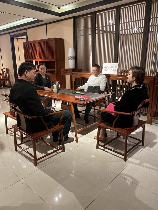 龙博士家居总经理莫文芳接待,为广西阳朔县政协主席陈庆武、广西阳朔商会会长徐自文等领导嘉宾一行介绍了红木家具的源起以及龙博士家居的品牌发展历程及产品特色