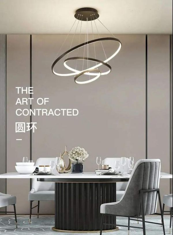月影家居的这款餐厅吊灯,造型设计极具创意。三个可自由变换的圆环给整个空间增添灵动和跳跃感,向下拉伸的直线与向上延展的圆环,传递出一种独特的几何之美。