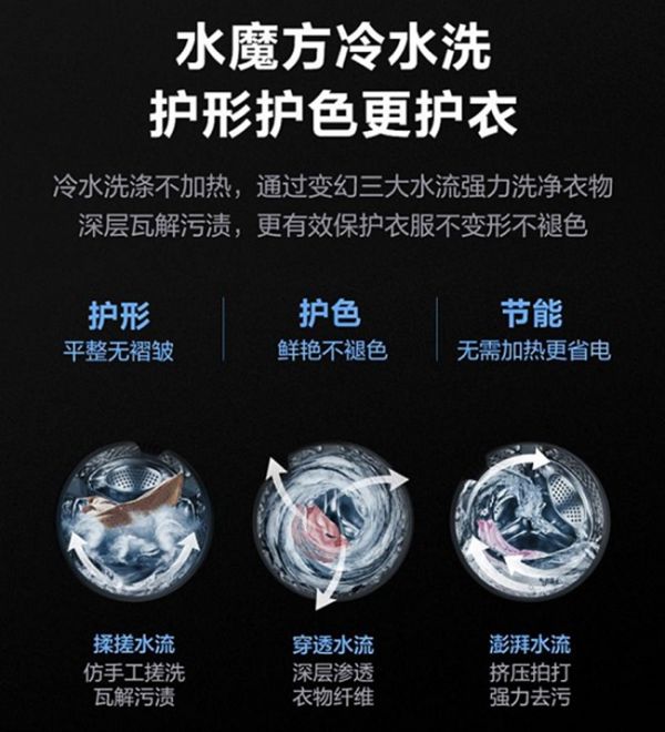 小天鹅超微净泡水魔方技术,在常温情况下,内筒转速在45~200转之间转换,输出澎湃水流、穿透水流、揉搓水流三种循环清洗模式,三种魔幻水流从弱到强形成智能洗涤节拍,同时配合3D立方内筒,无需加热,就可达到滚筒40℃水温洗衣机的相同洁净度,同时还能有效呵护衣物纤维,减少脱色率。相比传统的热水洗衣,衣物在洗涤后会有明显的掉色,晾晒时候的褶皱也会比较严重,小天鹅超微净泡水魔方的“冷水洗涤”,在呵护衣物,减少热水对面料的伤害的同时,真正做到色彩鲜艳无褪色、纤维紧实无变形、衣物平整无褶皱。
