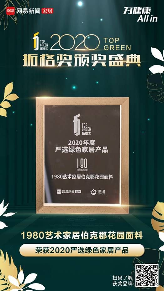 2020拓格奖颁奖盛典当天,1980艺术家居伯克郡花园面料产品被评为“2020年度严选绿色家居产品”。获奖产品受中国住宅科技产业技术创新战略联盟、深圳市建筑科学研究院(300675)、深圳市绿色建筑协会、住绿科技、网易家居等权威机构及专业媒体的共同监督认可。