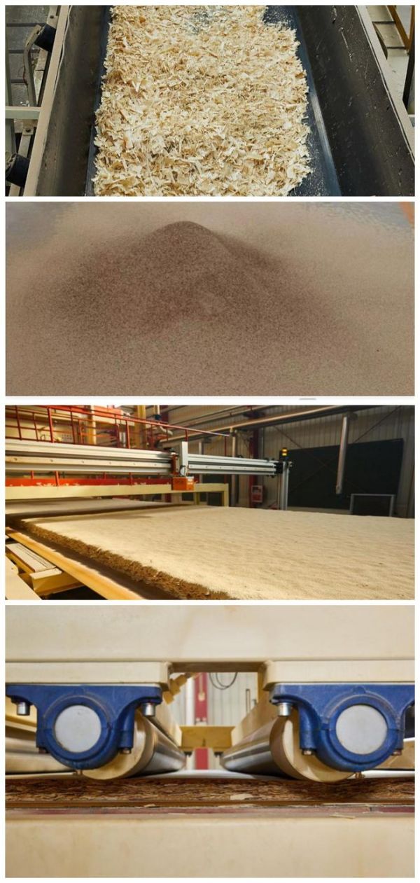 以曲美原木结构板生产工厂为例,原木木材从投料口进入生产线后,清洁剥皮—刨切—喷胶—铺装—热压—晾晒—养生—切割—砂光—激光打码—包装等均由生产线自动完成。车间内整洁有序,闻不到明显的异味,就连砂光车间也看不到任何粉尘。