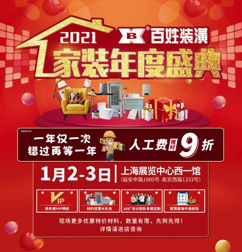 为了提供更好的家装服务,百姓装潢将于元旦1月2日-3日在上海展览中心西一馆举办“2021家装年度盛典”展会,让消费者更直观地体验品牌建材,并和设计师深入沟通了解装修流程。现场带来超值12项年度VIP特权,更有人工费9折,巅峰让利。力度空前,不容错过。