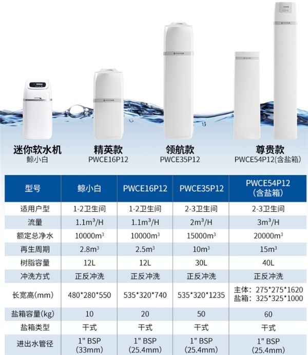 这其中,鲸小白的树脂容量12L与盐箱容量10kg,足够三口之家使用,而且半米高,放在卫生间不会挤,萌萌的还很可爱。其次,精英款与鲸小白相比体积相差不大,盐箱容量增加一倍,延长了使用时间。领航款软水机不仅体积大了一些,树脂容量与盐箱也提高了3-5倍,能覆盖两到三个卫生间使用。含盐箱的尊贵款滨特尔软水机总净水量在20000m³,水量更多,沐浴洗涤衣服可以同时进行,很适合空间宽裕,对生活品质要求高的家庭。