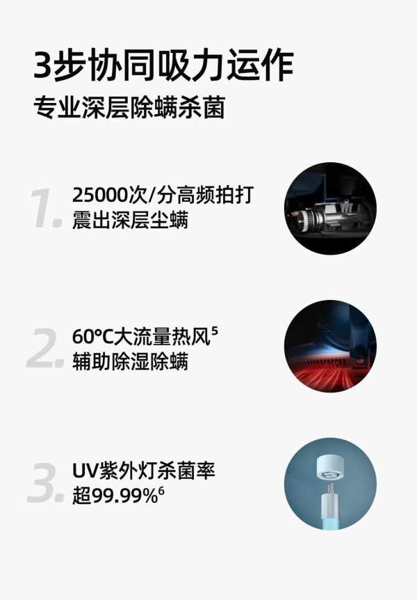 在保证大吸力的同时,小狗MC05除螨仪还升级高频拍打,热气流杀菌以及UV紫外线灯管三大功能,做到更深层除菌杀菌效果。