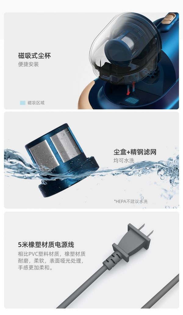 不仅如此,与很多市面上同类产品不同的是,小狗MC05除螨仪在尘杯设计上也非常人性化。磁吸式尘杯设计,拆装快速便捷;尘杯和过滤器均支持水洗,清水洗净晾干后即可循环使用,解决同类产品清理不便,滋生细菌等问题,给用户一个干净彻底的清洁体验。