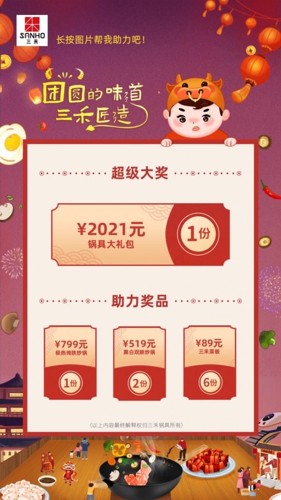 线上官方发声渠道,三禾将分别在微信端、微博端互动送出价值不菲的新春锅具礼品。其中微信端三禾官方公众号发起了人气抽奖助力活动,邀请好友扫码即有机会获得价值不低于2021元的锅具大礼包;微博端将联同主视觉发布新年愿望征集有礼活动;此外京东平台推出粉丝关注礼赠活动,凡参与活动即可获得超值优惠券和新人礼,尽享锅具超值好价。