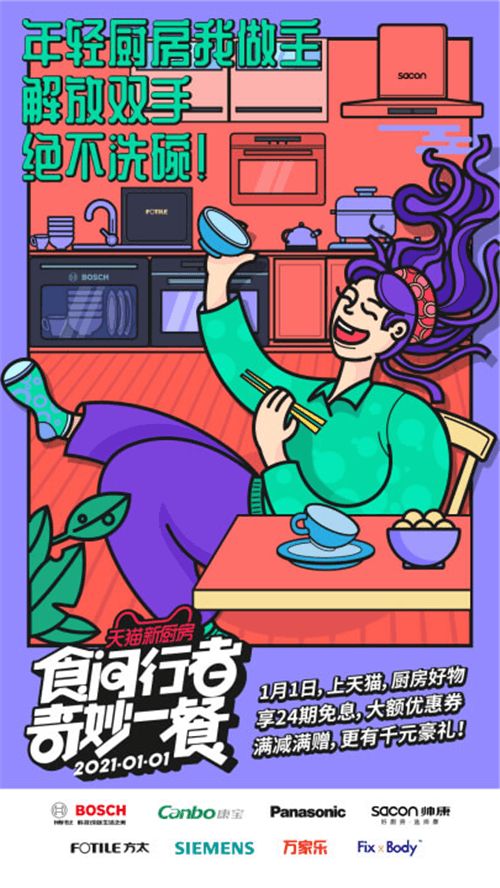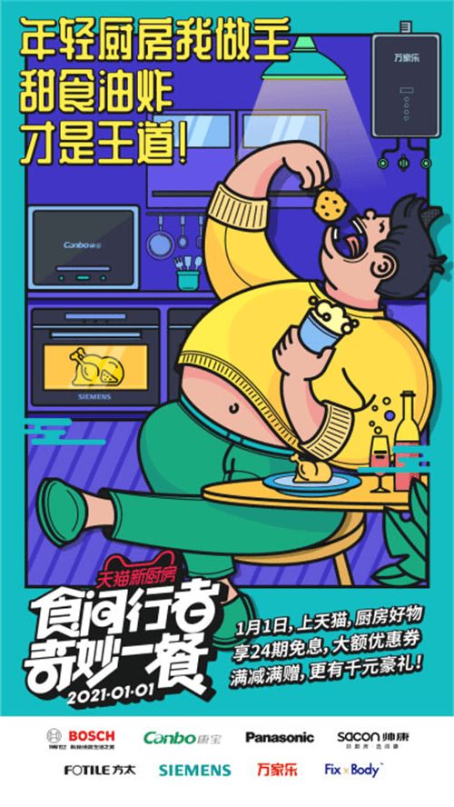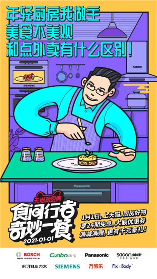 可见,年轻人抵触的并非是美食或烹饪这种行为,而是传统、枯燥、繁琐的厨房生活。如何让年轻人了解到新厨房生活的魅力,点燃他们下厨的热情?近日,天猫《食间行者·奇妙一餐》活动举办,西门子、万家乐、博世、松下、帅康、康宝、方太7大品牌,与天猫、B站UP主、微博大V等众多参与者一起,展现年轻人的“奇妙一餐”,并以点带面,绘制新厨房生活场景,展现全新的烹饪⽅式和⽣活理念,让年轻人摆脱对传统厨房的看法,真正喜欢并投入到厨房生活中来。