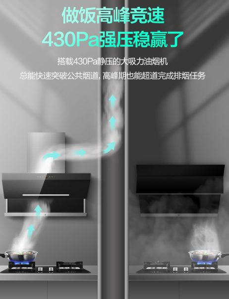 选购油烟机的时候,很多人会不关注风压这个指标,但这个指标实为重要,关系到做饭高峰期油烟是否会倒灌,高层住户这个问题尤为明显。所谓的油烟倒灌指的是当公共烟道中的风压高于油烟机向外排风的风压时,原本排入烟道中的油烟会倒灌回厨房的情况。L26T烟机针对风压,加入了430Pa超强风压设计,能够将油烟顺畅地通过公共烟道排出去,就算是做饭的高峰期,也能保证厨房空气的持续清新。