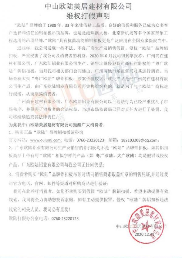 3、消费者购买“欧陆”品牌铝扣板吊顶时请向销售商索取盖红章的销售凭证,并通过我司官方电话、官网、邮件等渠道对所购商品进行验证;
