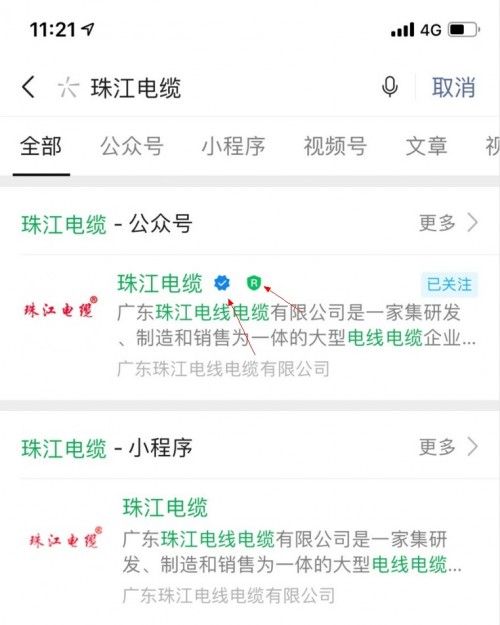 3、打开微信搜一搜,在搜索框搜索“珠江电缆”,会出现带有R标的标志。